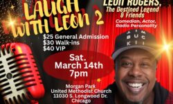 Laugh With Leon 2 Comedy Show and Fundraiser Saturday, March 14th 7pm-10pm. (show and reception) Leon Rogers and other comedians. Tickets: $25.00 general admission Tickets: $40.00 VIP Tickets $30 at the door, general admission only Location: Morgan Park United Methodist Church, 11030 South Longwood Drive Chicago, IL 60643 Get ready to double over and laugh out loud with Comedian Leon Rogers! Get tickets at: bit.ly/laughwithleon2